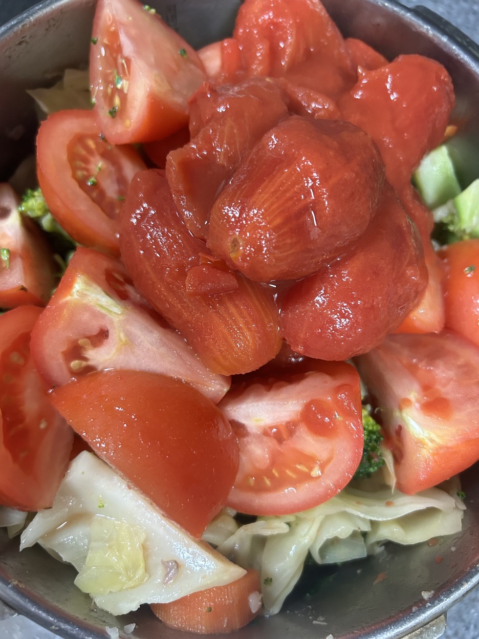 7. 양이 점점 많아져서 위아래 뒤적뒤적 잘 섞어준 후 토마토와 토마토 퓌레 1통을 넣어줍니다.